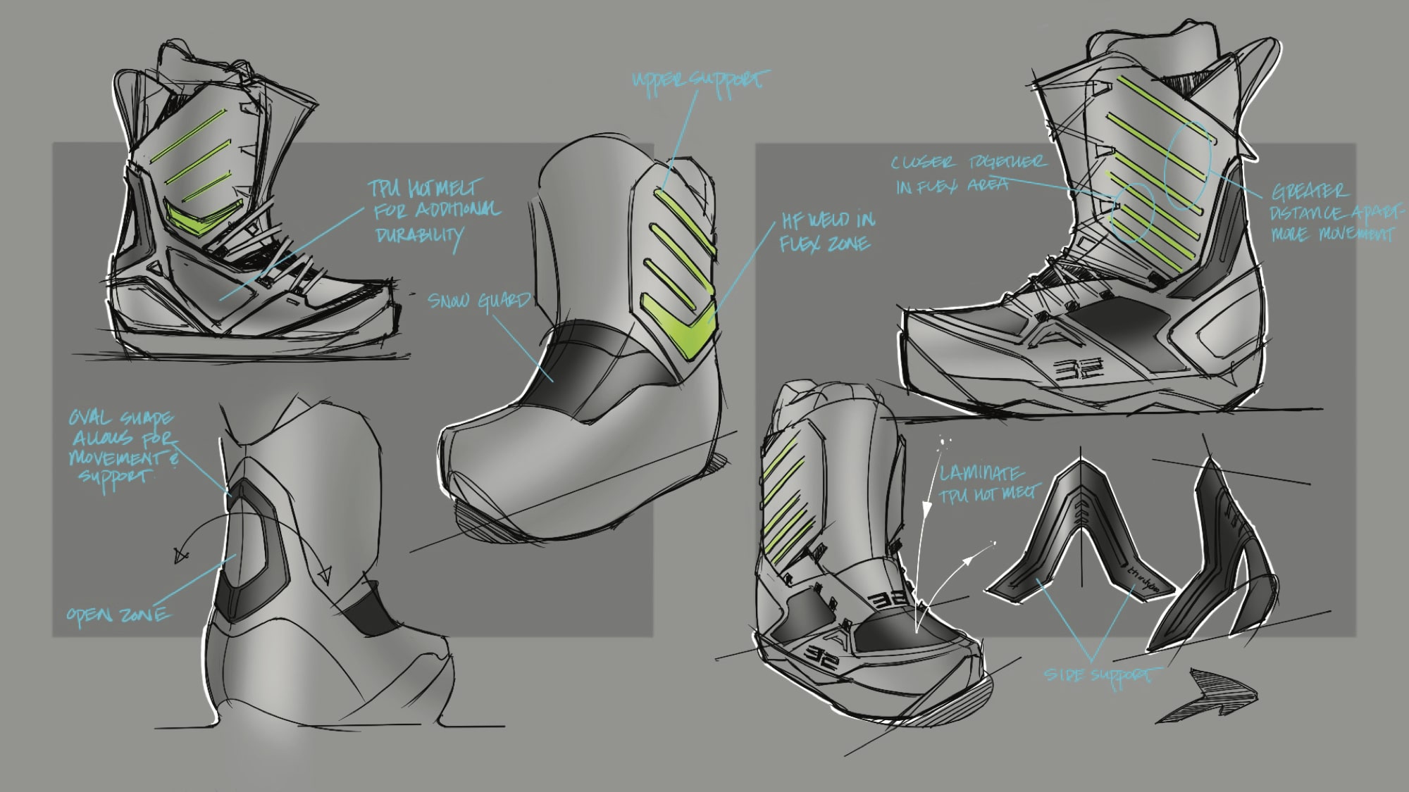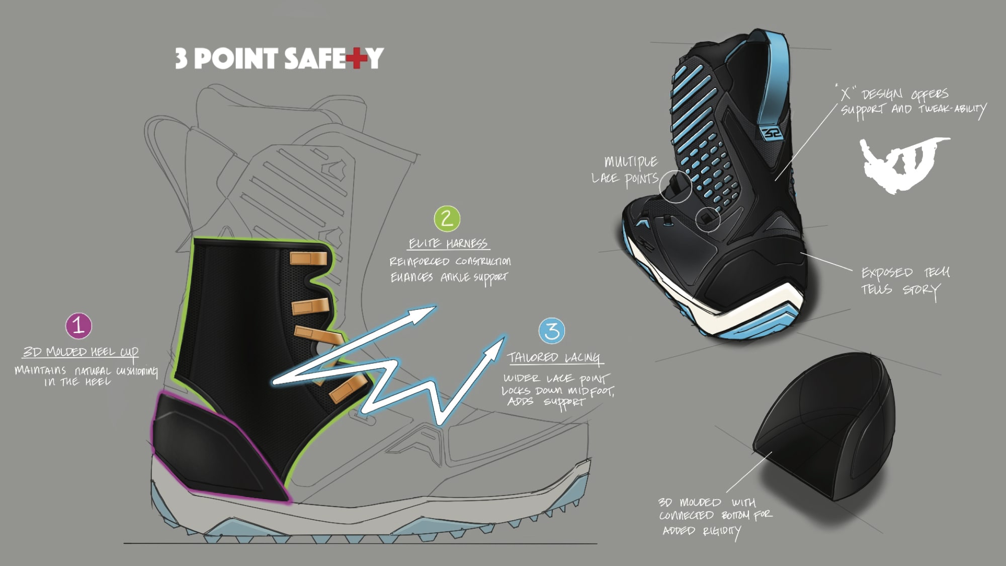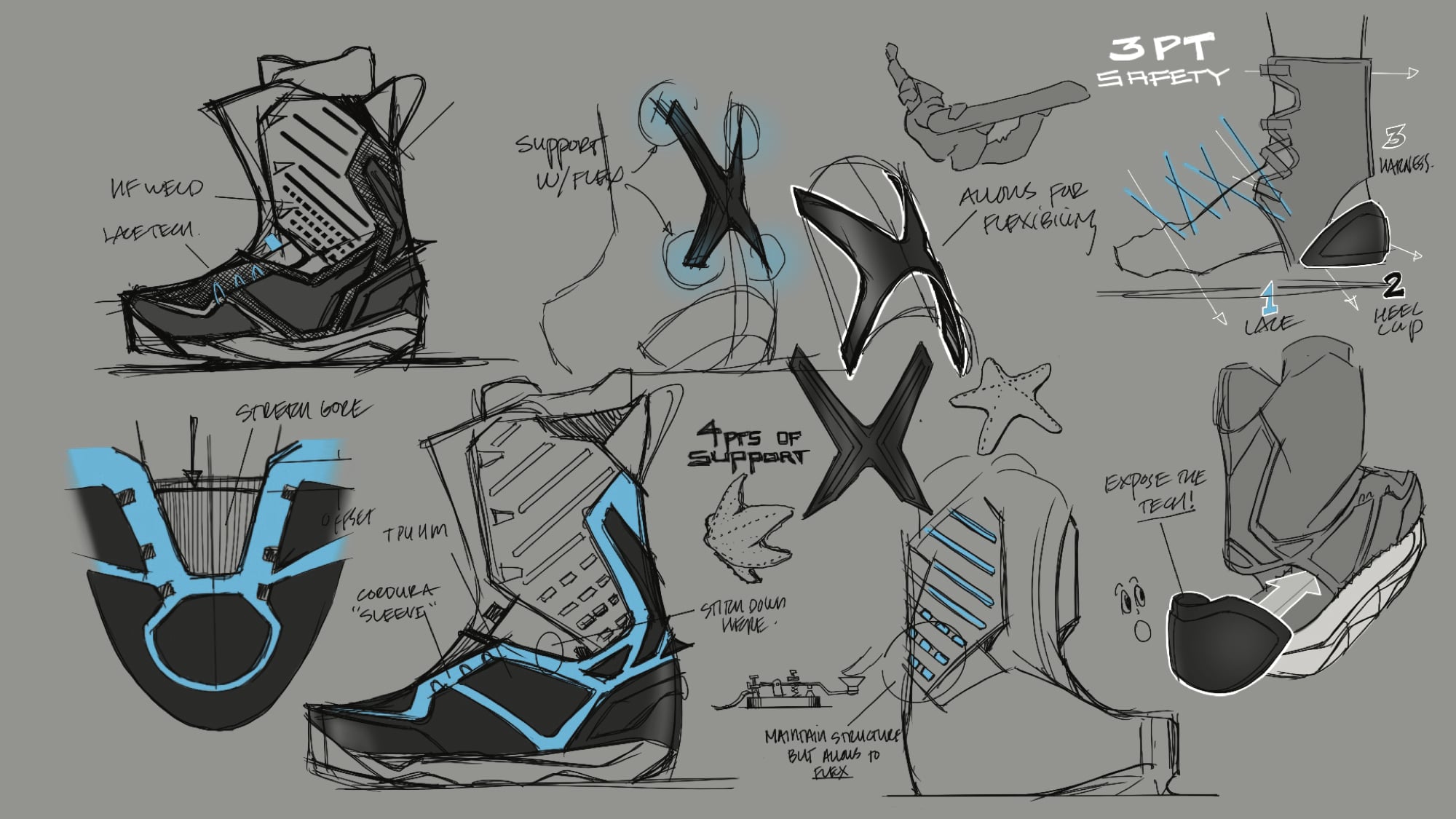 The challenge is to design a snow boot that provides protection for the ankle and foot with stable lockdown solutions. Address ways to improve cushioning to alleviate heel bruise. The boot construction should also enhance Muller’s riding style facilitating movement and flexibility. Aesthetics should be a reflection of the safety features and functionality.