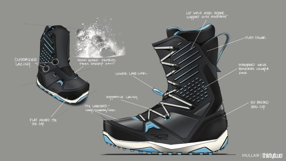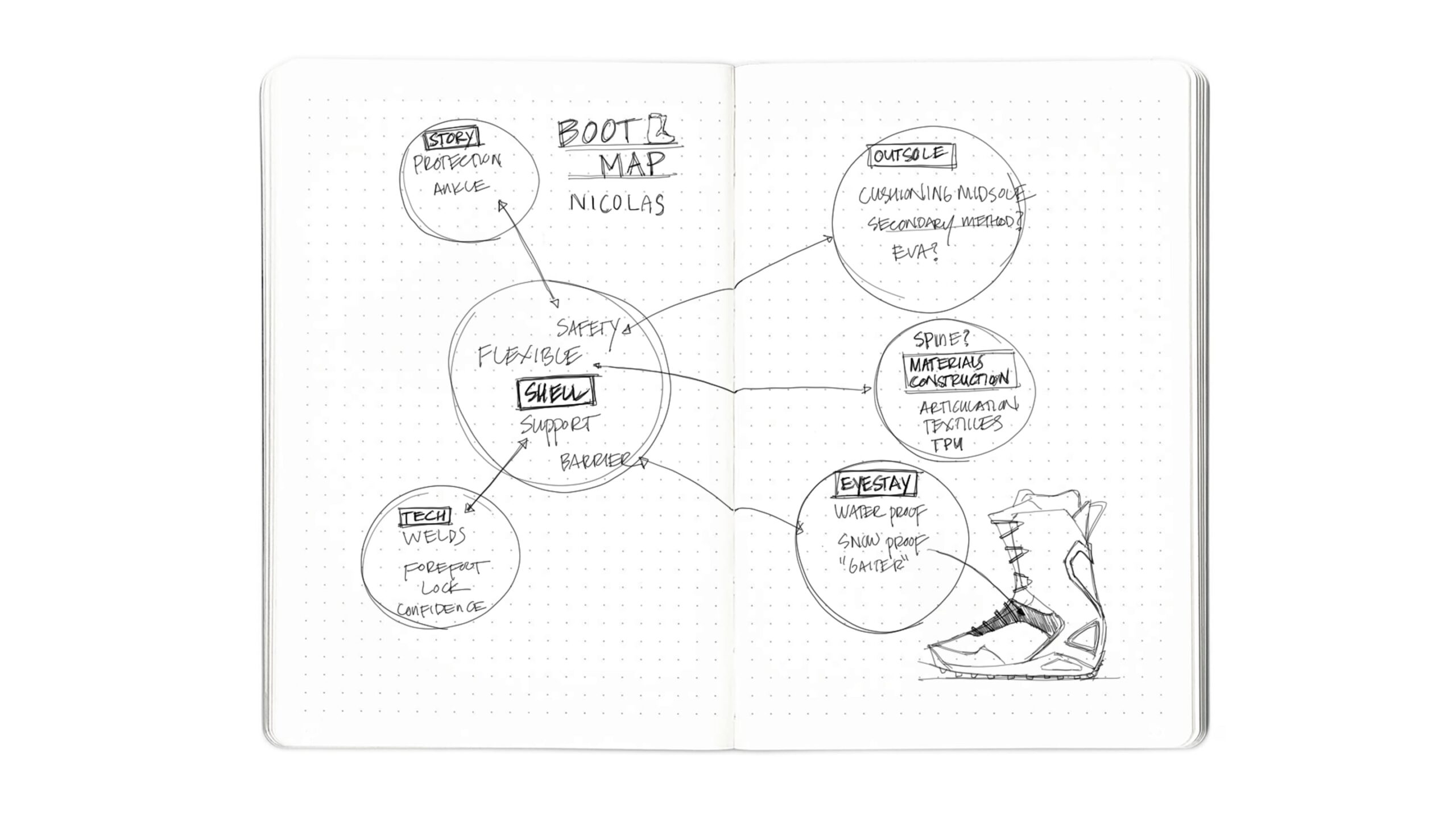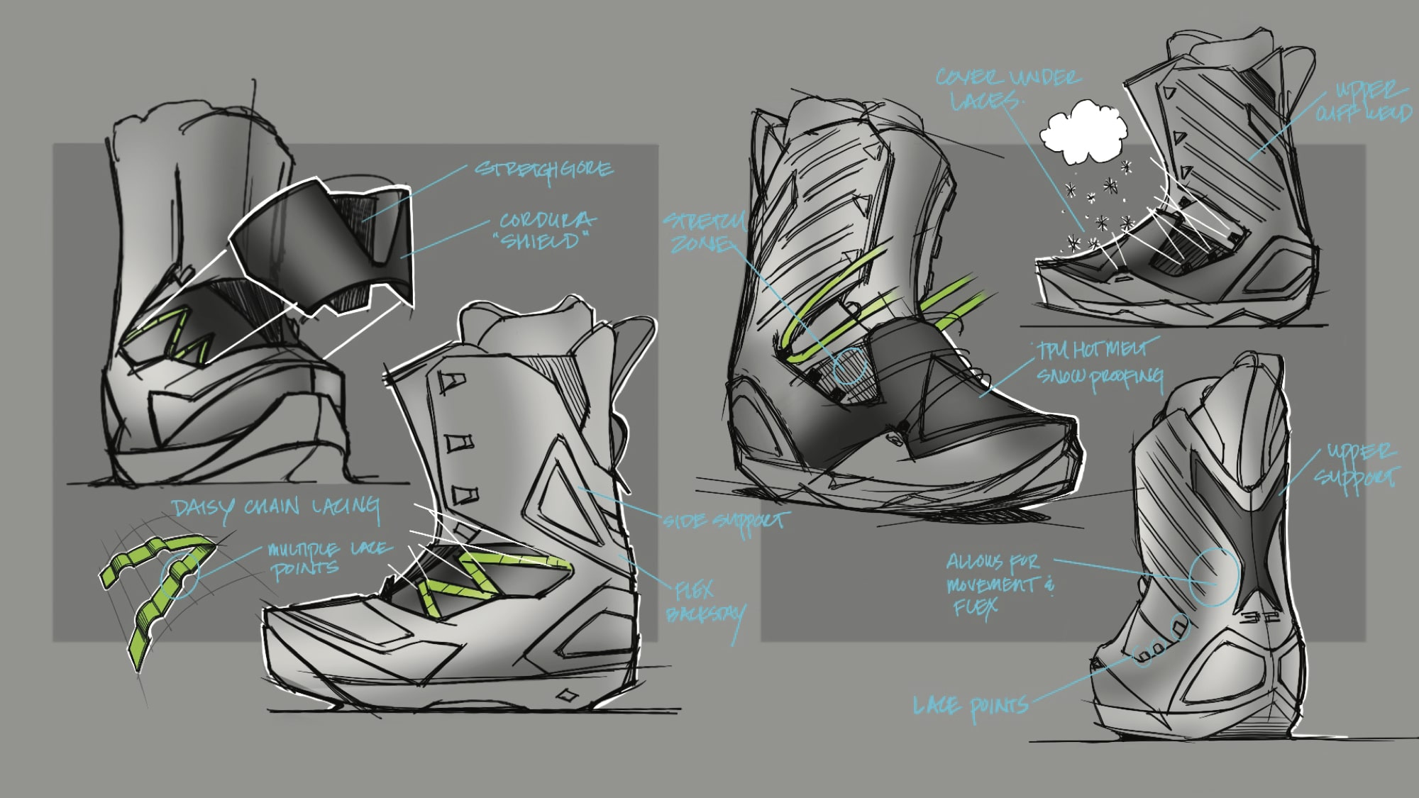 The challenge is to design a snow boot that provides protection for the ankle and foot with stable lockdown solutions. Address ways to improve cushioning to alleviate heel bruise. The boot construction should also enhance Muller’s riding style facilitating movement and flexibility. Aesthetics should be a reflection of the safety features and functionality.