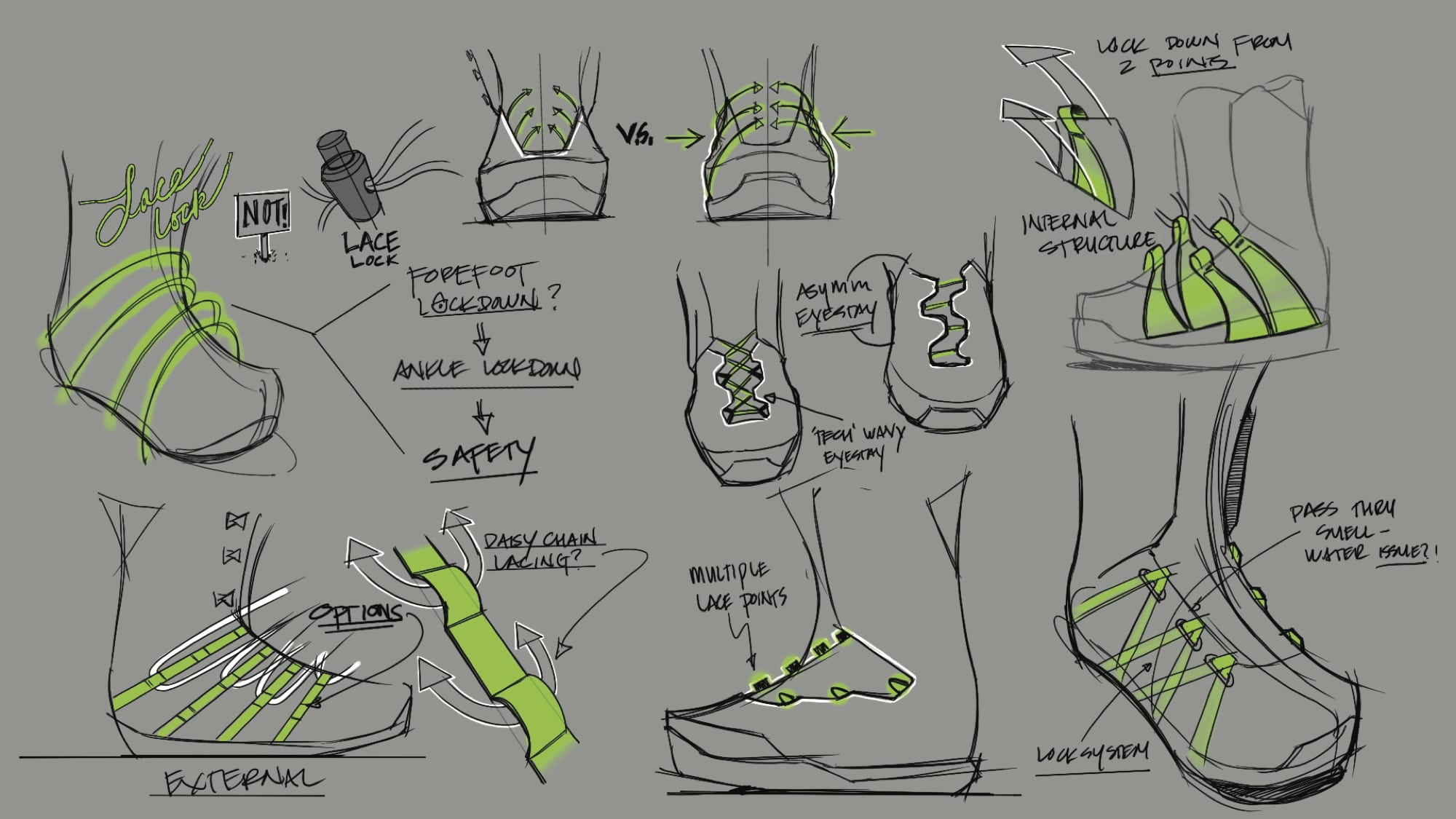 Piecing together all the themes from the ideation phase the boot begins to take shape. Utilizing welds for support and flexibility, a lower half gaiter for weather protection and wider eyestay positioning for enhanced forefoot lock.