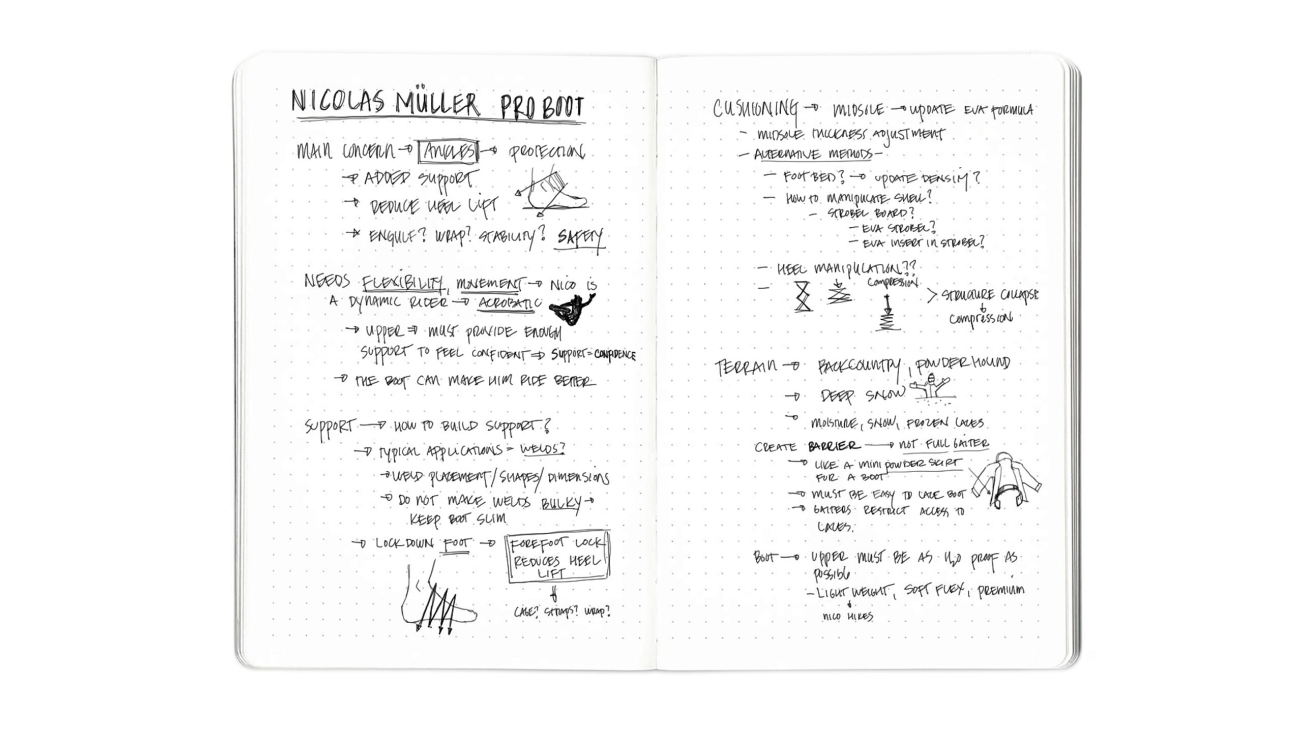 Since suffering an ankle injury early in his career, Nico has been primarily concerned with ankle support and heel cushioning. Snow boots are typically built for comfort, relying on soft plush liners that entice consumers with initial fit which quickly loses shape and becomes ill-fitting. Support and stability is based on how tightly the boot can be laced providing a false sense of security.