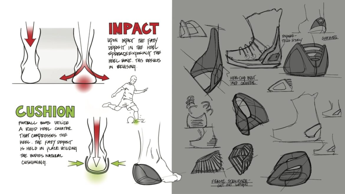 Addressing the issue of heel cushioning going beyond typical midsole foam for dampening. In place of a traditional internal heel counter we used a 3D molded heel cup, inspired from soccer shoes. This compresses the heel and keeps the fatty deposits from spreading out on impact, utilizing the bodies natural cushioning.