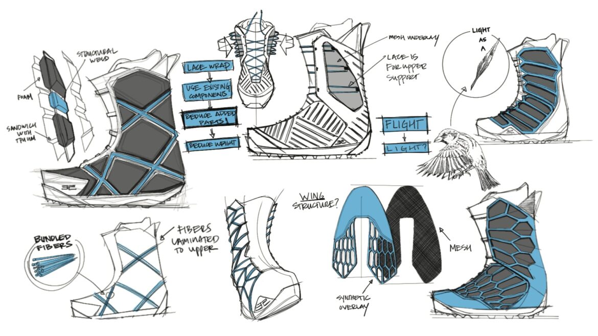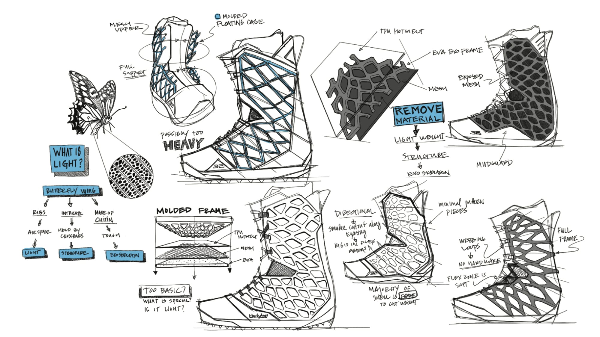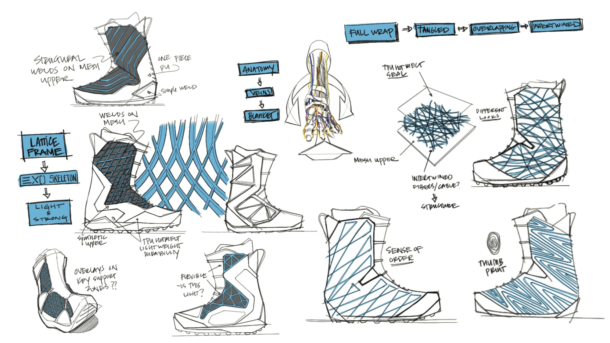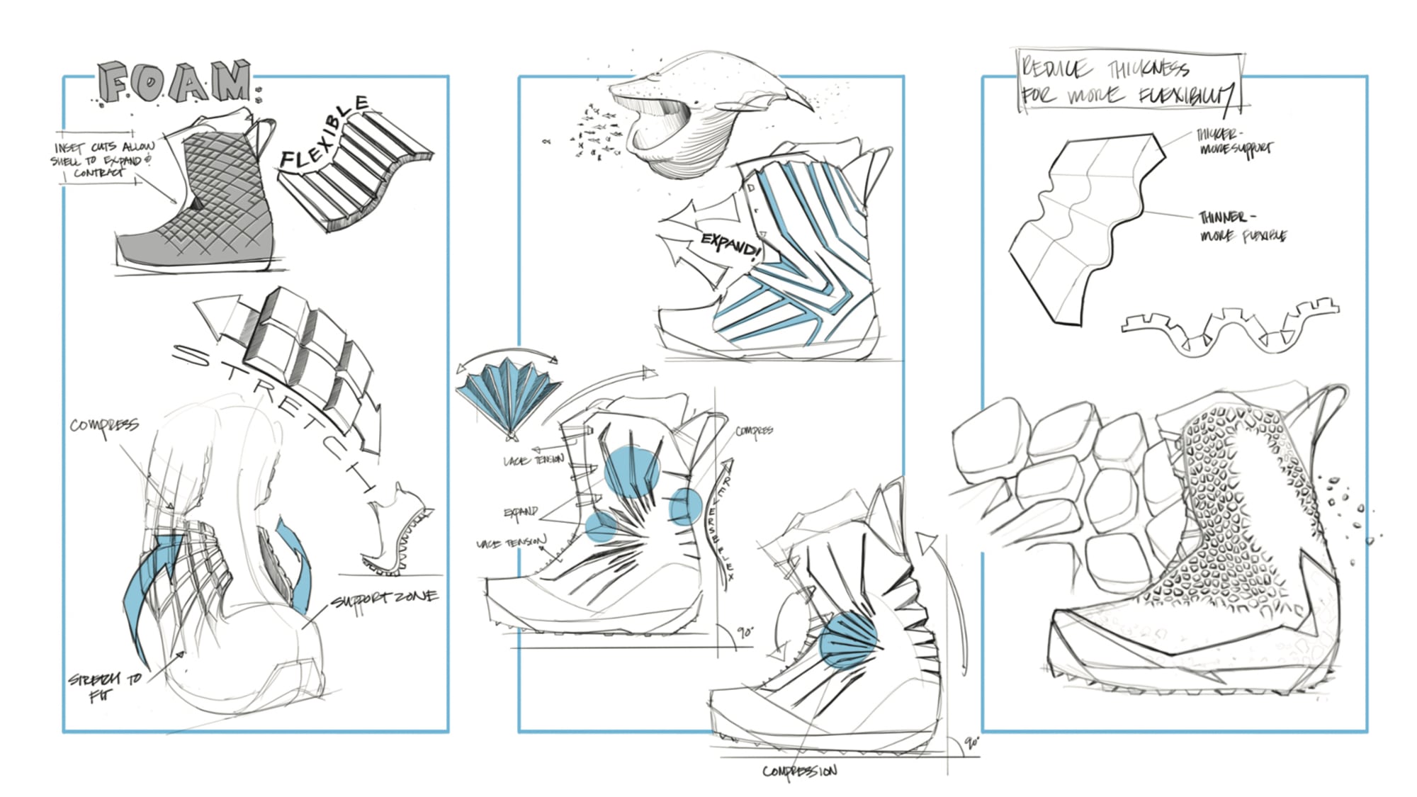Traditional boot construction limits solutions for durability and lightweight. Brainstorming lead to exploration of unconventional materials, unique shell construction and blue sky concepts.