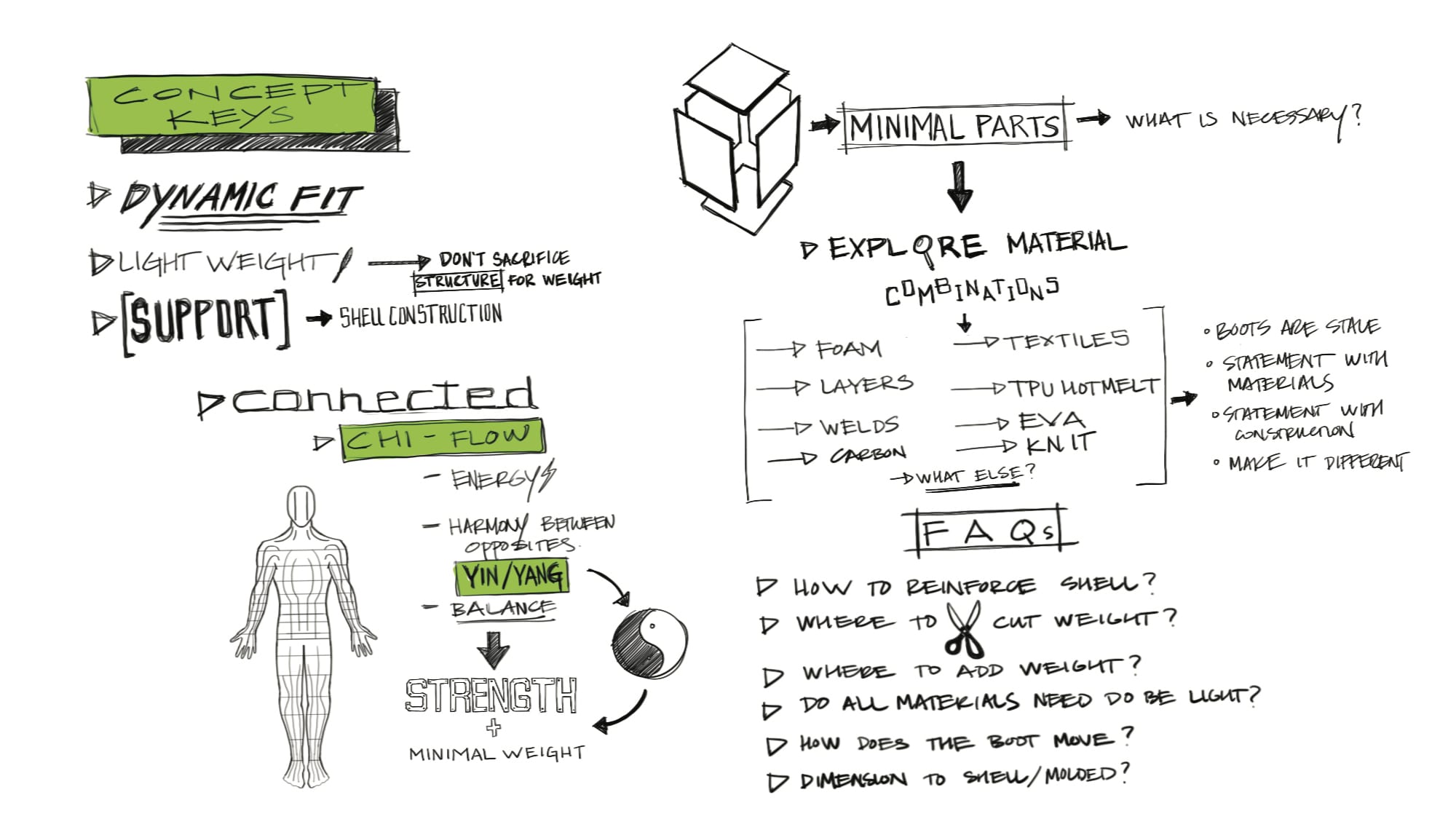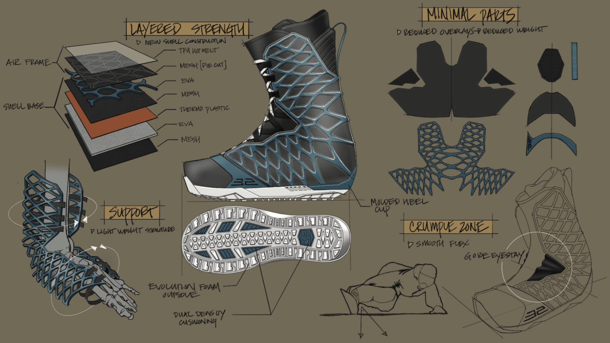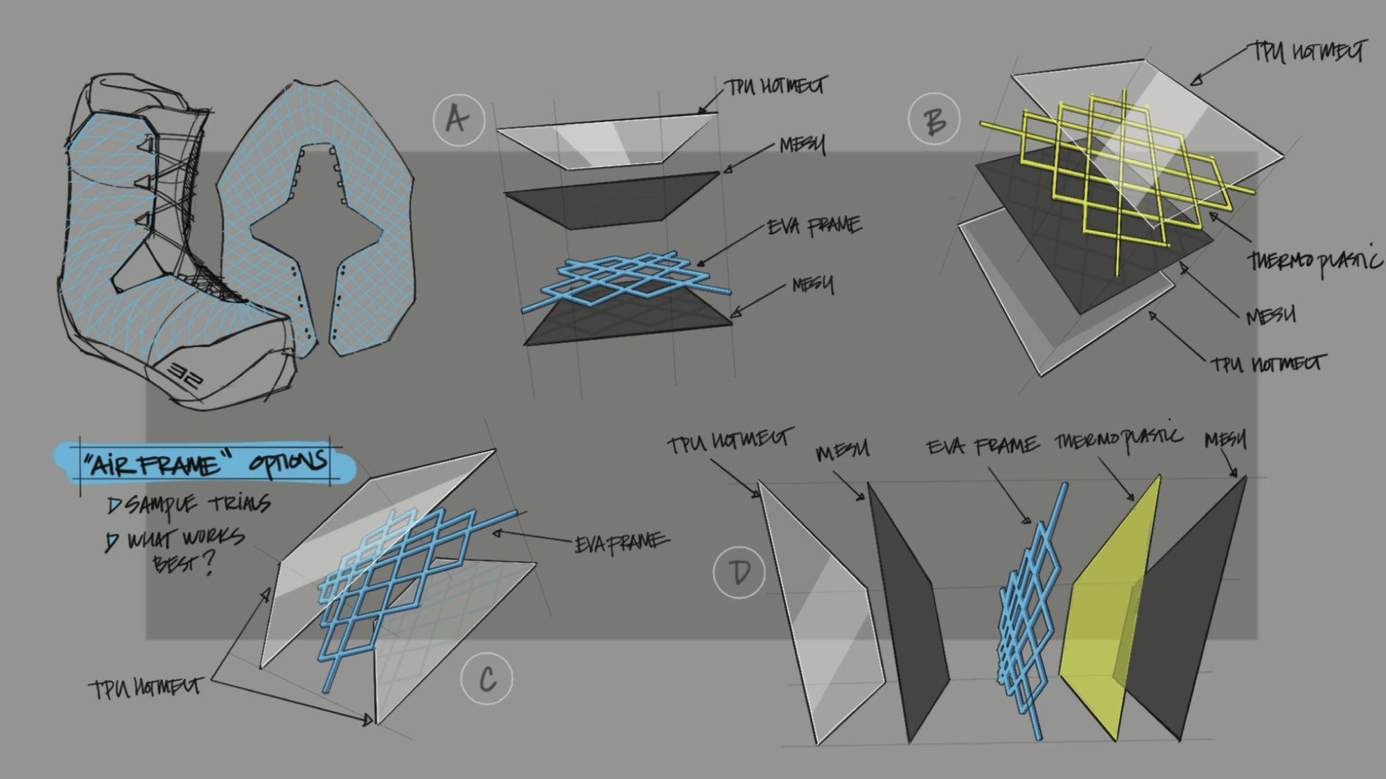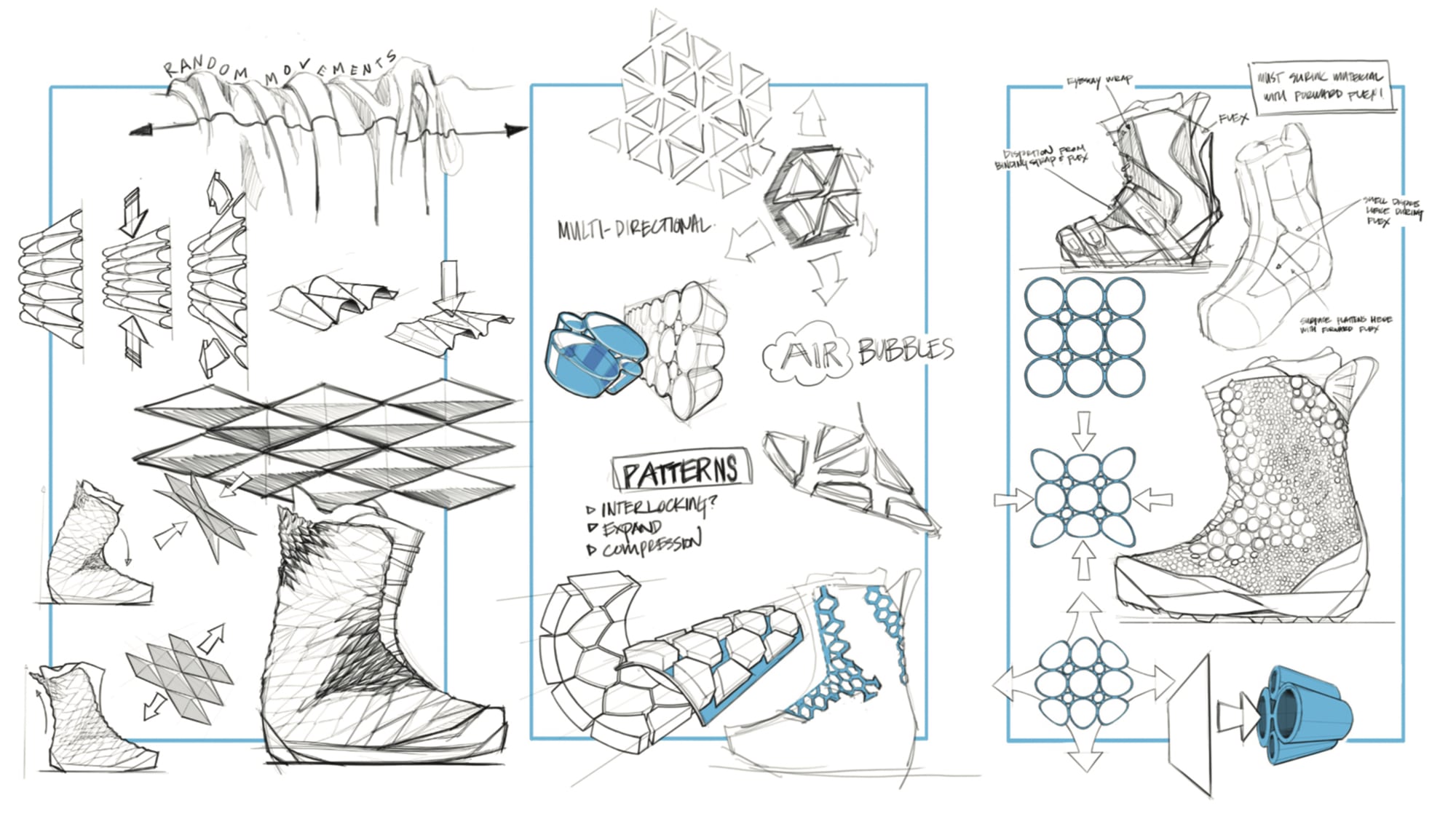 Traditional boot construction limits solutions for durability and lightweight. Brainstorming lead to exploration of unconventional materials, unique shell construction and blue sky concepts.